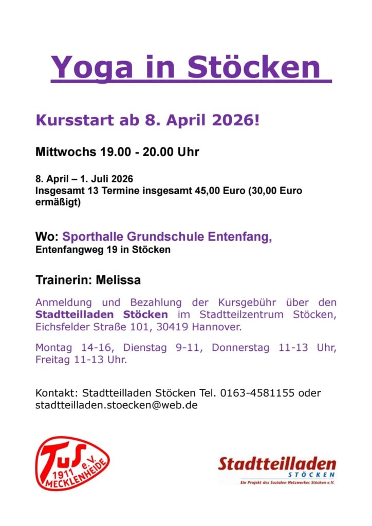 | Mittwochs: | Yoga | 19:00-20:00 Uhr, GS Entenfang, Entenfangweg 19, 30419 Hannover |